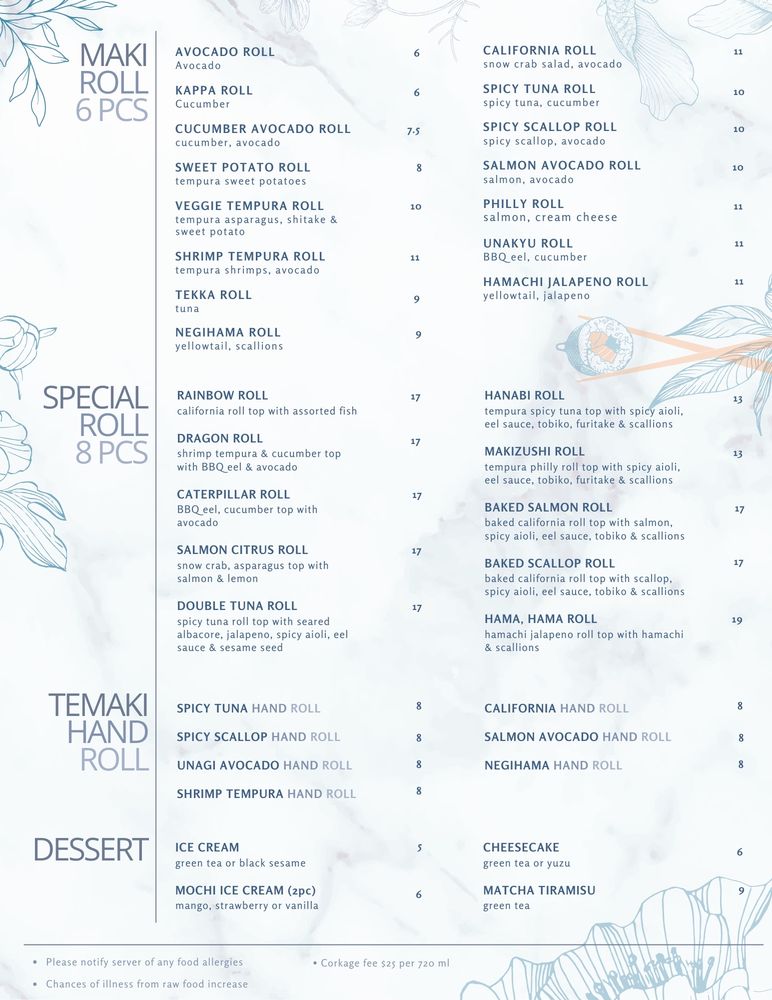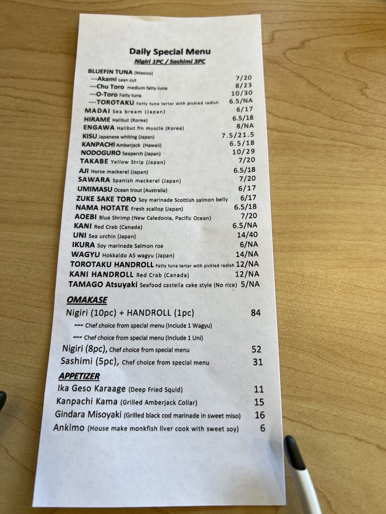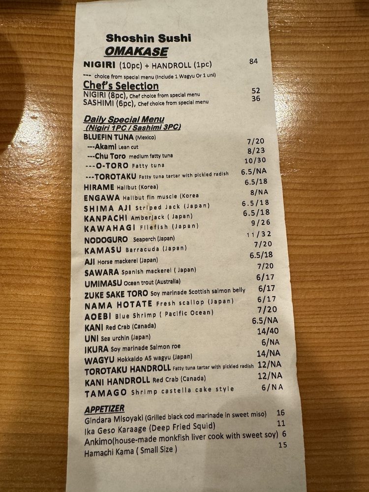 The menu boasts an array of options, featuring premium cuts like Bluefin Tuna in various forms—Akami, Chutoro, and the luxurious OToro, accompanied by seasonal specialties such as Anago and Shima Aji. For those seeking a rich experience, the Omakase at $40 promises a curated selection that showcases Chef Gary's talent.